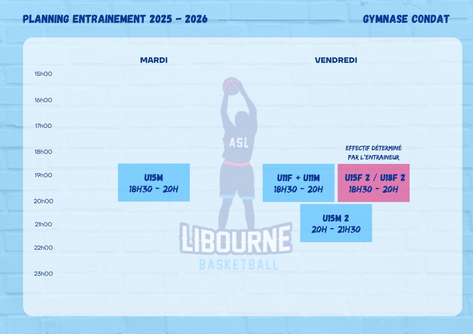 Retrouvez toutes les informations des entraînements : jours, horaires, salles, coachs et coordonnées des entraîneurs. TÉLÉCHARGEZ LE PLANNING |