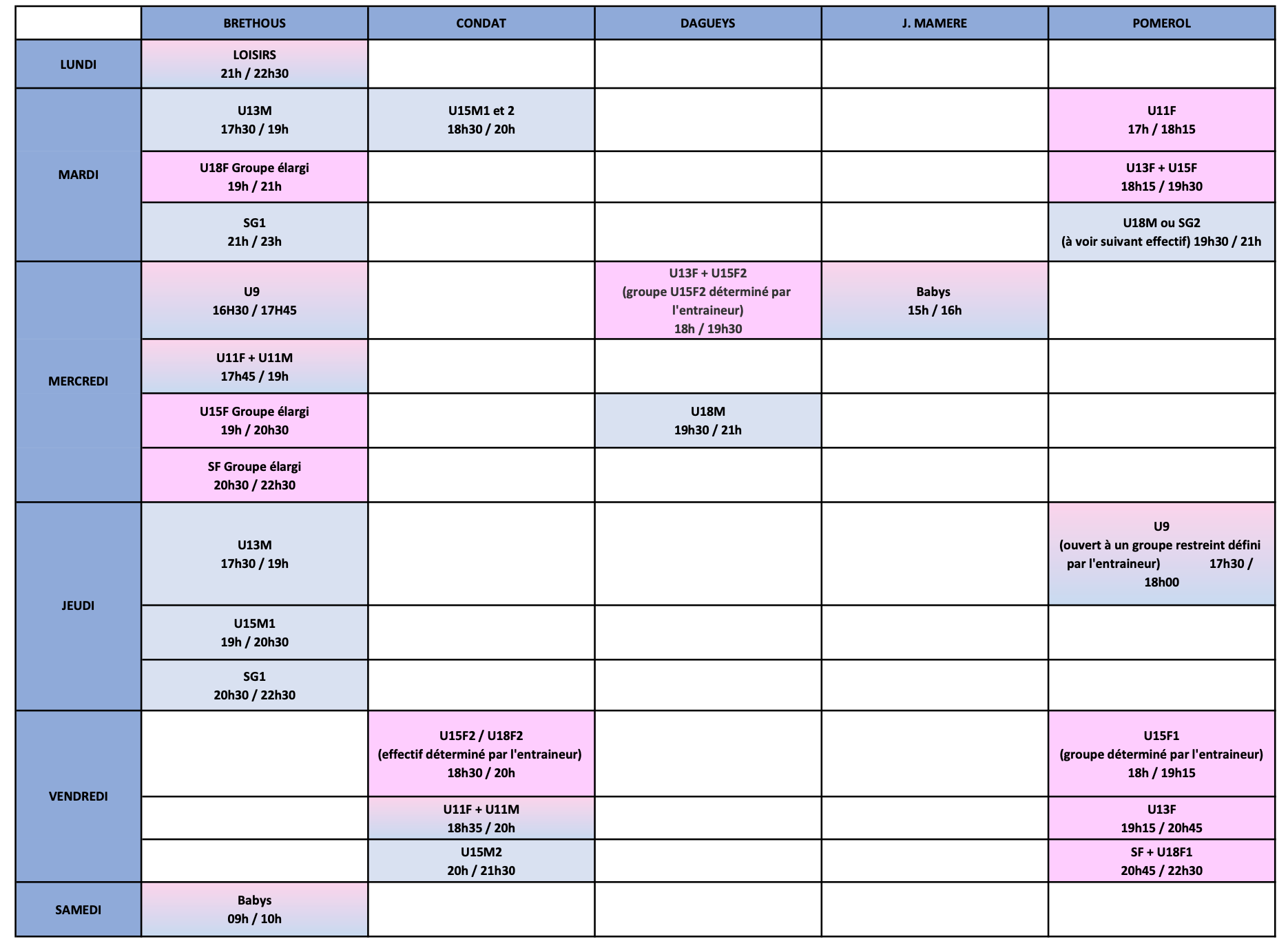 Découvrez les créneaux d'entraînements par catégorie en téléchargeant le planning d'entraînement de la saison. Il est fortement conseillé de se rapprocher de son entraîneur régulièrement pour toute évolution éventuelle du planning.